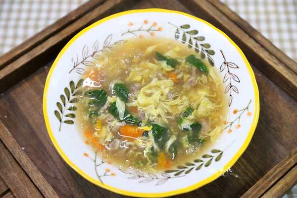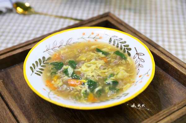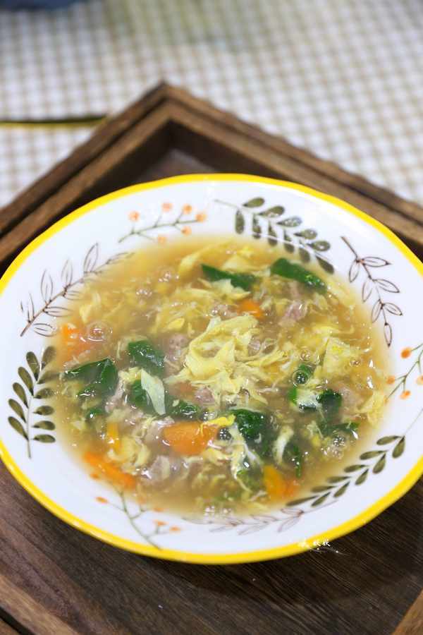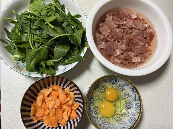 用料:菠菜一把,牛肉一块,鸡蛋两个,胡萝卜一根,水淀粉一碗,盐少许,胡椒粉少许,麻油一勺,老抽一勺。