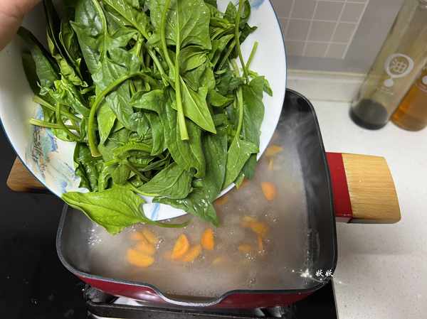 5,菠菜嫩苗可以直接倒进去,如果是比较粗壮的枝叶,可以切碎放进来,没有菠菜可以换成其它时令的叶子菜,菠菜的口感甜,更适合放入。
