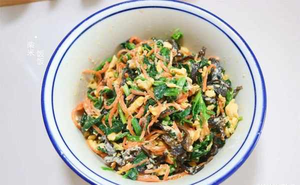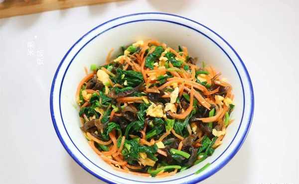 4、将菠菜、木耳、胡萝卜丝和煎好的鸡蛋一起倒入。用盐和蚝油调味,拌匀。