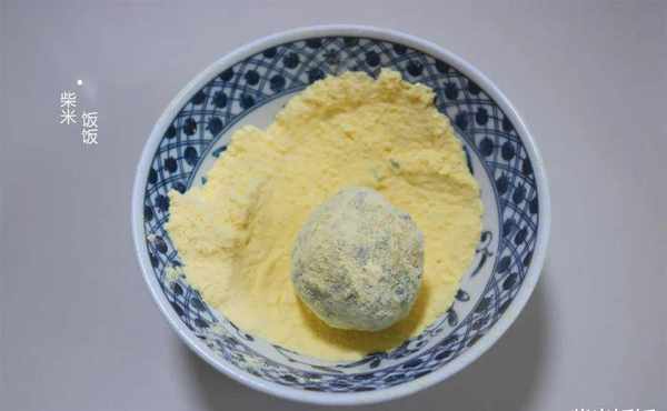 7、在菜饺子表面滚一层玉米粉,拿在手上,重复2~3次,使玉米粉均匀、牢固地粘在蔬菜表面。