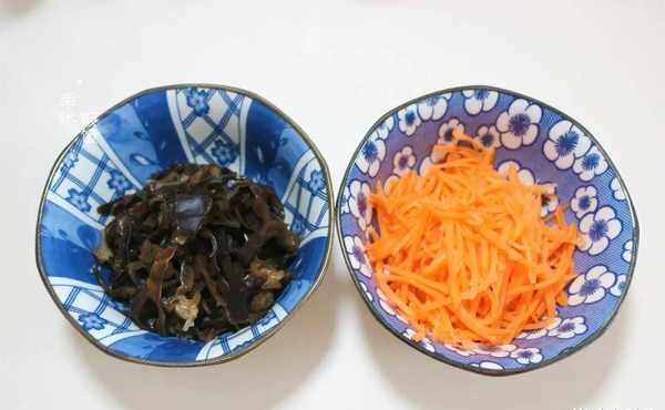 3.准备一些胡萝卜丝和木耳丝。倒入沸水,大火焯一分钟捞出。