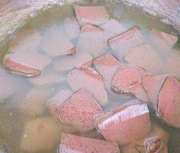 3锅内加入清水烧开,然后把猪血放进去,烫煮2分钟捞出,把水分控干净!