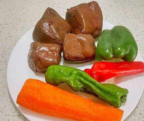 2把猪血切成片,辣椒切片,胡萝卜切菱形片(美观好看)