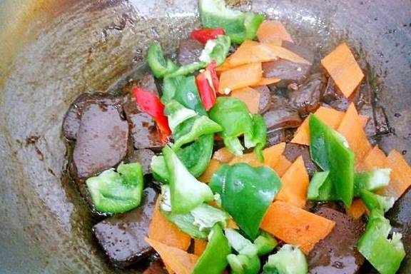 5当猪血炒至入味的时候,把辣椒胡萝卜片放进锅里,用大火煸炒至断生,加少许盐味精调味后,出锅装盘即成!