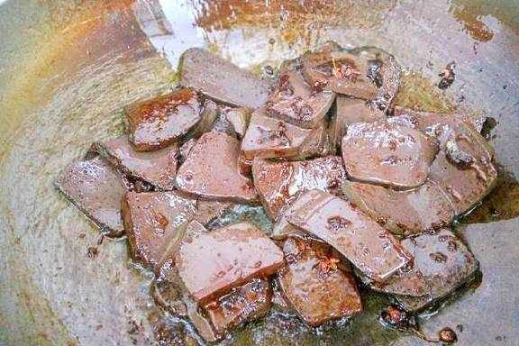 4锅内放入底油,先放八角花椒炸一下,然后加入豆瓣酱耗油生抽炒出香味,放入料酒猪血翻炒!