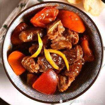 3、热锅凉油,油热后下入姜片、葱段、郫县豆瓣酱、番茄酱、甜面酱,炒出香味儿,加入牛腩块儿翻炒片刻,加入料酒去腥,然后加入适量盐、白糖、生抽、老抽,再加入适量的牛肉汤,大火烧开。