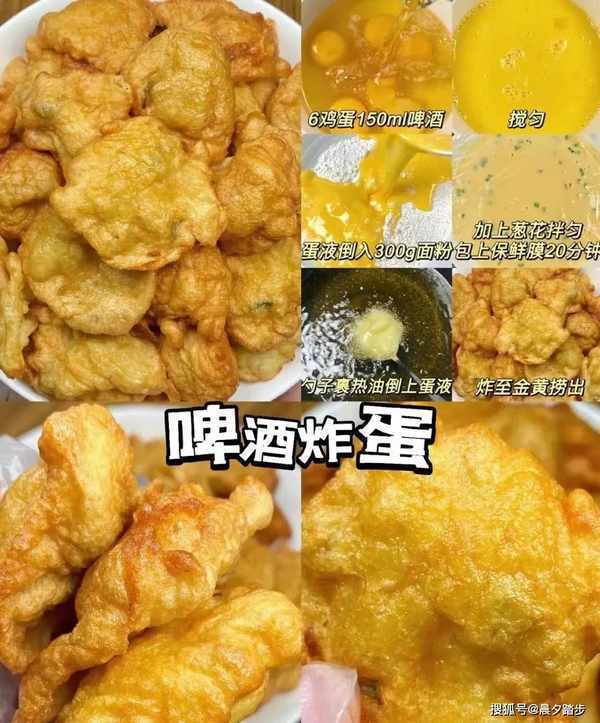 步骤:将150毫升啤酒加入6个鸡蛋中,搅拌均匀。将鸡蛋液倒入300克面粉中,加入葱花拌匀,包上保鲜膜静置20分钟。我们把勺子涂上热油,然后盖上蛋液,炸至金黄捞出(我们可以直接用勺子舀出适量的蛋液,倒入锅里煎)