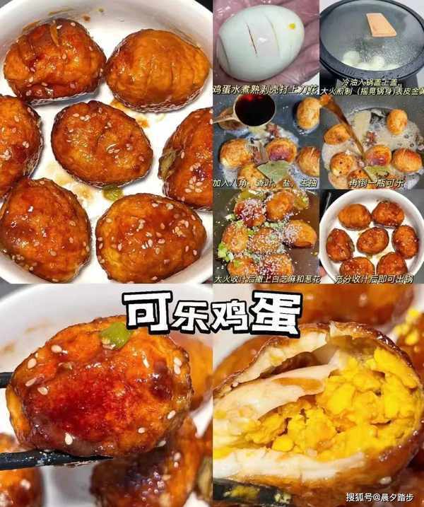 做法:将煮鸡蛋去皮,在上面放一把花刀。锅中放入冷油,盖上锅盖。大火炸至表皮金黄(摇锅翻面),加入八角、香精、盐、生抽,盖上一瓶可乐转大火收汁