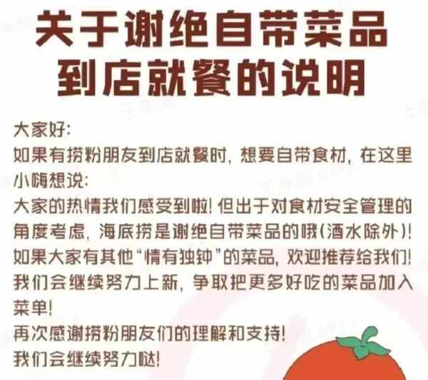 前几天有网友发帖说, 去海底捞想煮自己带的食材时被拒绝。随后海底捞官方发布公告,以后“谢绝顾客自带菜品”。