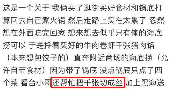 根据当时很多普通顾客的切身经验,海底捞也确实不会对自带菜品的消费者区别对待。