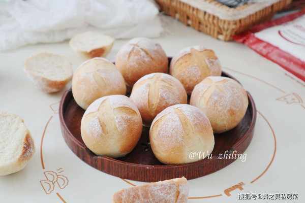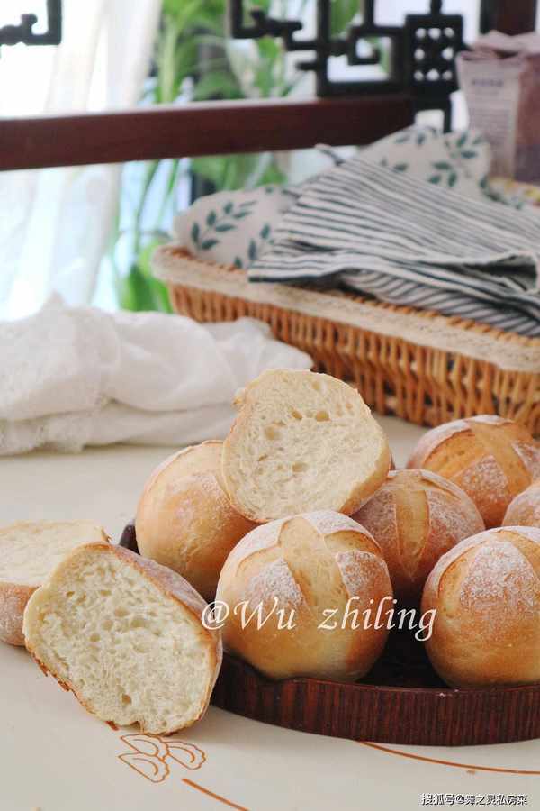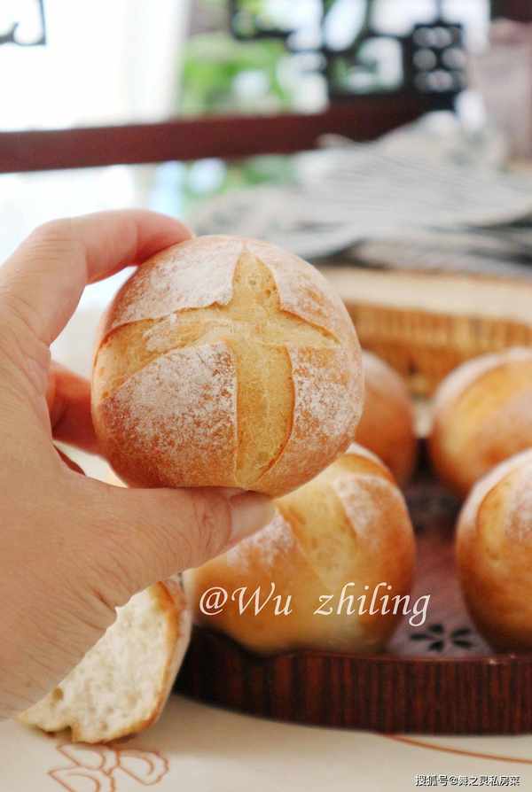 发酵好表面喷水,筛面粉,同时用刀片割十字刀口,放入提前预热好的烤箱,我是放入风炉180度15分钟出炉的。