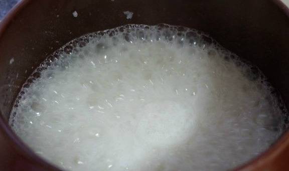 1、大米洗净加清水一起放在砂锅里熬煮成粥,熬到米烂开花,米汤渐浓的状态;