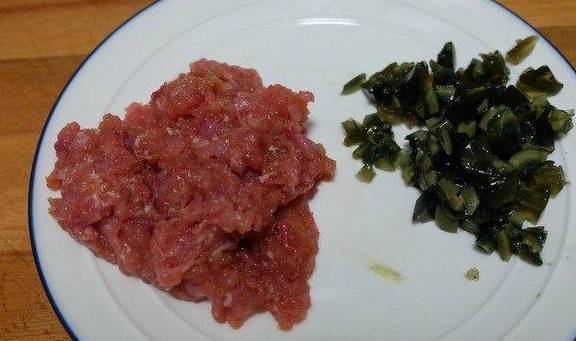 3、把瘦肉剁成肉沫,皮蛋切碎;