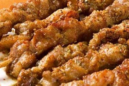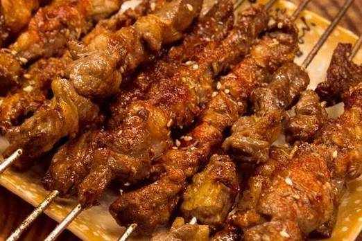 2.烤制羊肉串熟透时,撒上辣椒粉和孜然粉略烤几分钟即可上桌。