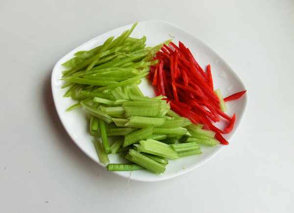 3. 青尖椒、红尖椒和香芹分别切丝。