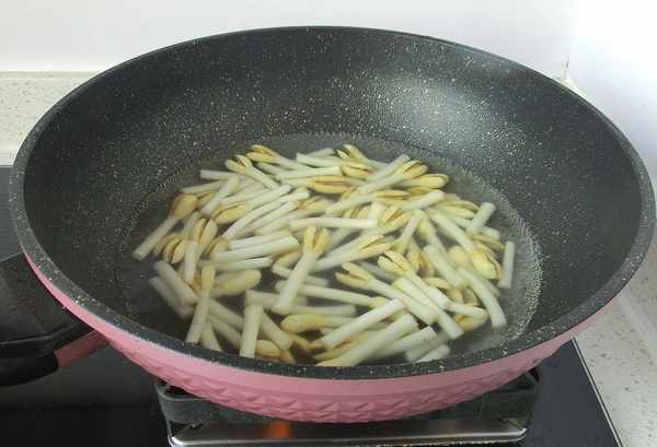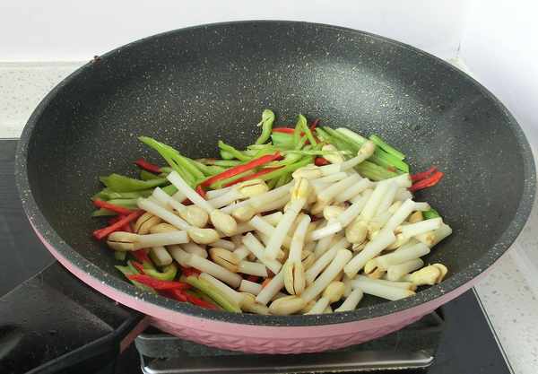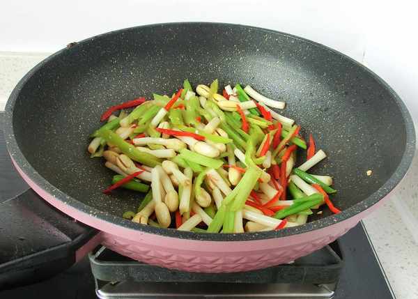 5. 锅烧热倒入葵花籽油,放几粒花椒炸香后捞出丢掉,随后放入香葱末炒香,下香芹、青、红尖椒丝翻炒。