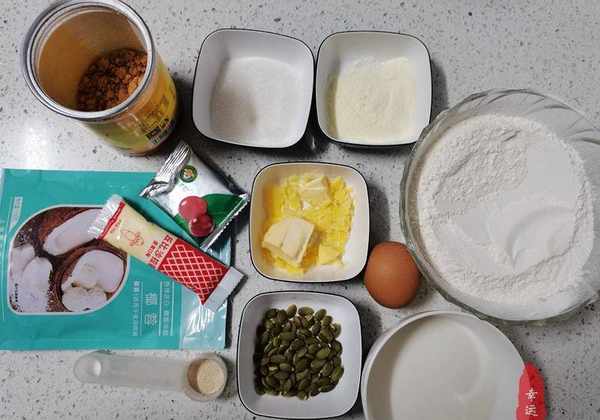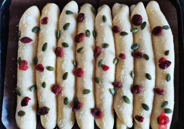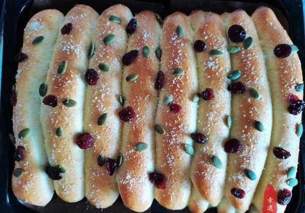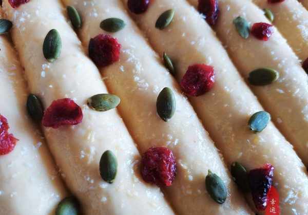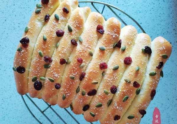 配料表:高筋面粉260克,鸡蛋55克,白糖25克,奶粉10克,牛奶140毫升,黄油25克,盐1.5克,耐高糖酵母3克粉、椰丝、南瓜子、肉松、沙拉酱蔓越莓干适量