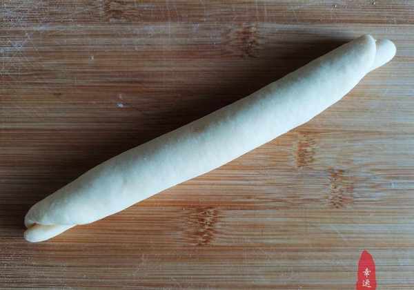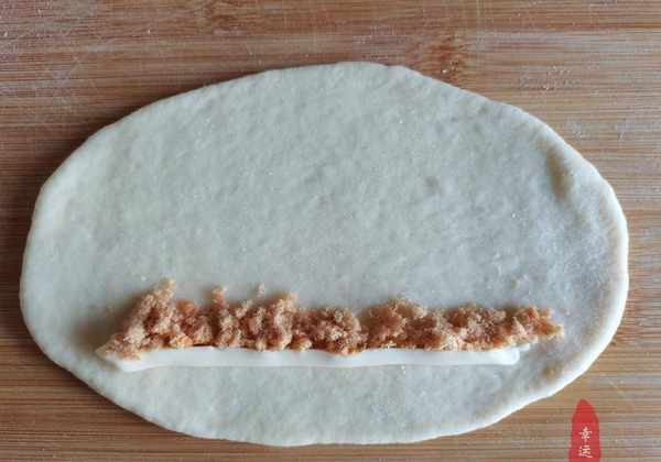 4、取出揉好的第一个面团,用擀面杖擀成椭圆形;挤一条沙拉酱,撒上肉松,从底部卷起,揉成条状,放入烤盘,盖上保鲜膜,防止干燥。