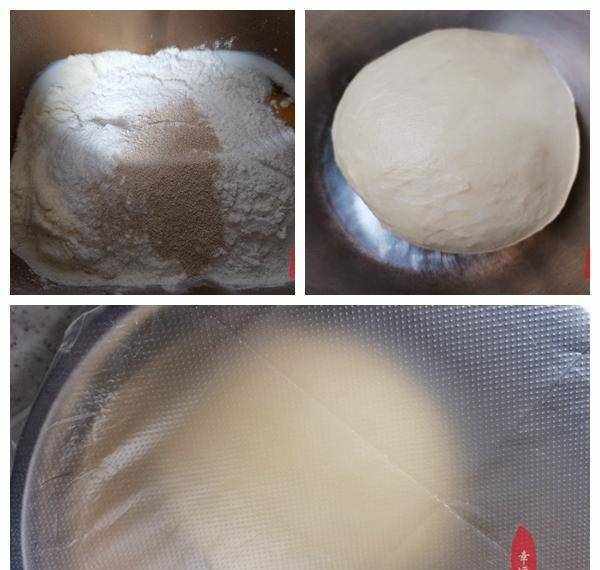 2、牛奶140毫升、鸡蛋55克、白糖25克、奶粉10克、高筋面粉260克、盐1.5克、高糖耐酵母粉3克放入面包机按顺序,开始揉面揉成光滑柔软的面团。盖上保鲜膜放入冰箱冷藏低温发酵。