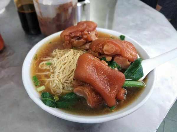 (4)把煮熟的外海面放入碗里,调入高汤,加入焖制好的猪脚,淋上酱汁即可。