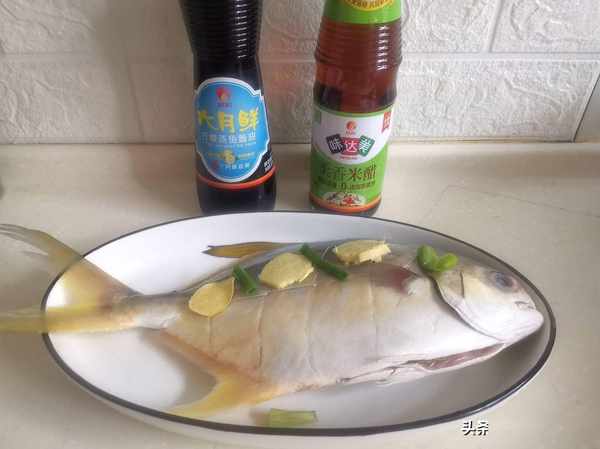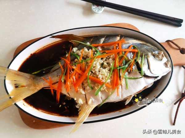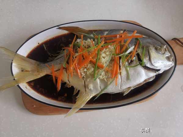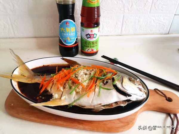 所用資料:金鯧魚1條,蒸魚醬油,柔香米醋,花生油,葱,薑,胡蘿蔔絲,小葱絲。