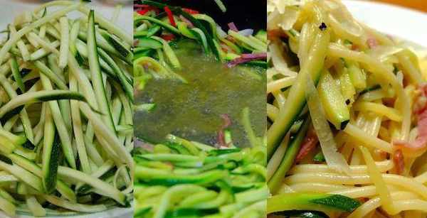 将栉瓜切细条或用削皮刀刨成薄片,大蒜切薄片,红辣椒切丝,培根或鯷鱼切碎。平底锅热锅后加入橄榄油,小火煎香蒜片,加入鯷鱼(或培根)与辣椒丝炒香,加入栉瓜翻炒到出汁整锅备用。煮好的义大利面入栉瓜平底锅加入一小块奶油拌匀,用盐与黑胡椒调味后装盘,刨硬乳酪丝装饰。