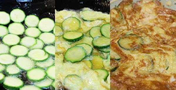 鸡蛋打散,栉瓜切片用少许油煎至表面略上色后倒入蛋汁中搅拌,用少许盐与白胡椒调味。将混合了栉瓜的蛋汁用小火煎至金黄。(也可以做成炒蛋)