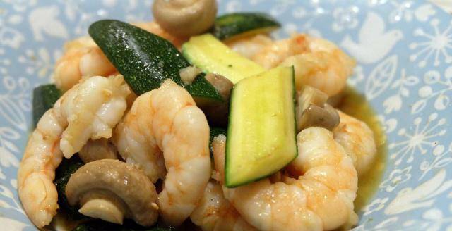 虾仁用太白粉与盐略抓过冲水洗干净然后用少许盐与白胡椒粉略腌10分钟,栉瓜直剖四半后切成斜条块,蘑菇切小块(不切也可以),大蒜跟姜切末。起油锅略炒虾仁至变色后取出备用,同锅加油爆香姜蒜末,加入栉瓜翻炒到略软后加入蘑菇与虾仁,大火翻炒约1分钟后用盐、糖调味。