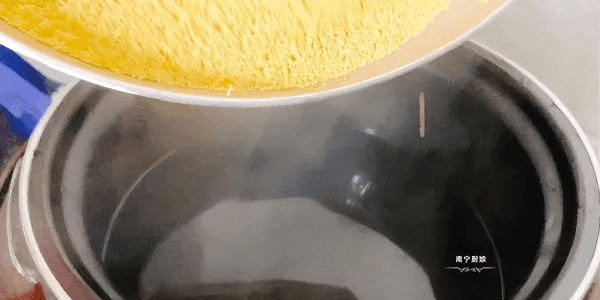 2、烧一壶开水,把水煮开之后,就可以将开水倒入电饭锅的内胆当中,然后再将我们炒好的小米一起倒入锅内。
