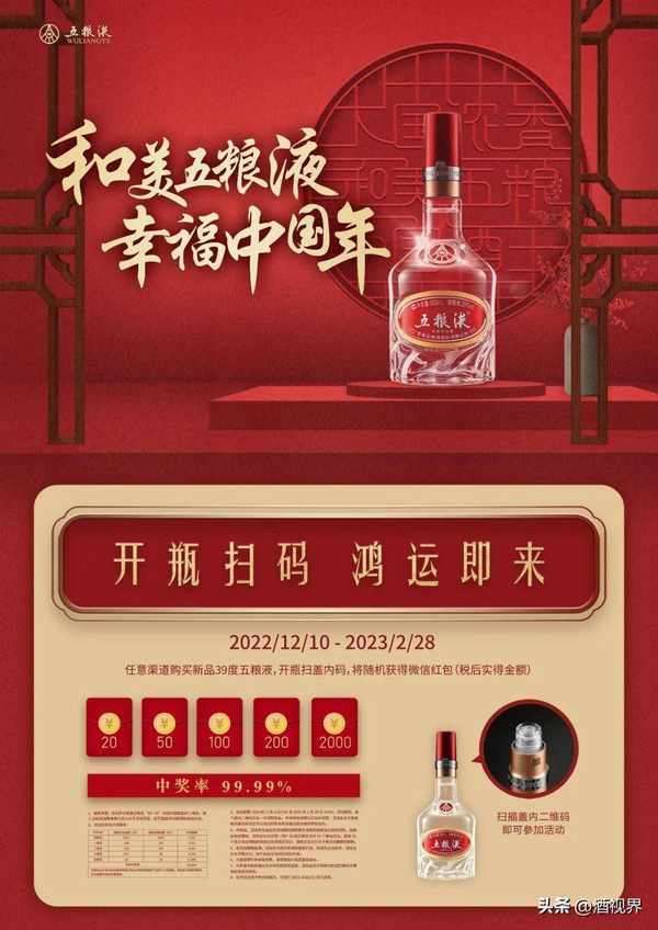 在此情况下,五粮液的“开瓶扫码季”活动成为了消费市场复苏的重要抓手。五粮液“元春开瓶扫码季”活动已于近日启动,消费者购买五粮液1618、39度五粮液,开瓶扫盖内码,便有99.99%的概率获得红包,大奖最高至2000元。