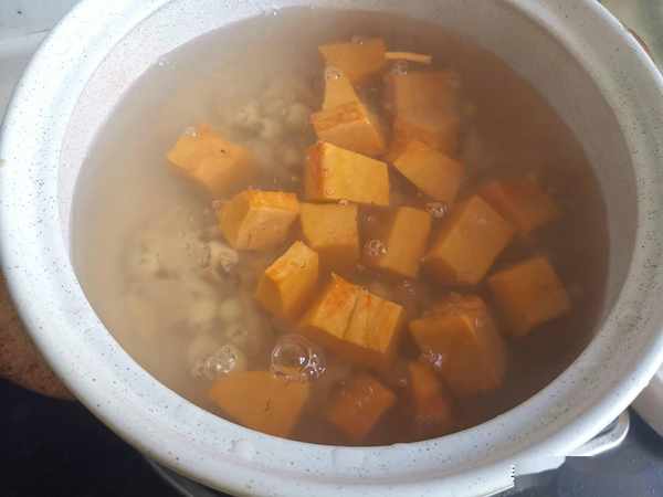 第五步:加入南瓜塊,南瓜比較好熟後放入就可以。