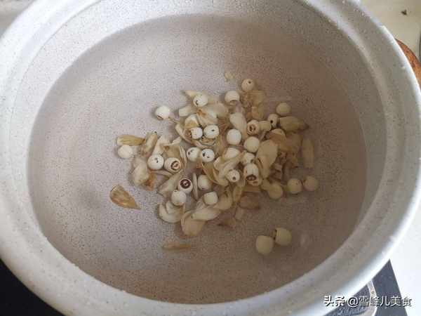第四步:砂鍋放上水,加入百合和蓮子燒開煮大約10分鐘。如果是浸泡開的百合和蓮子就不需要提前煮。
