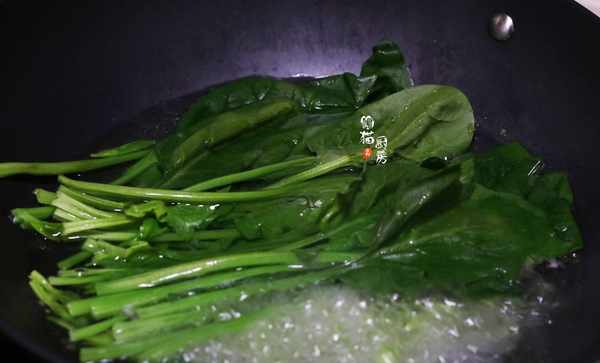 洗干净的菠菜和青豆汆烫熟,加适量盐调味。然后把菠菜夹出,挤干水分然后把菠菜切成整齐的中段备用。