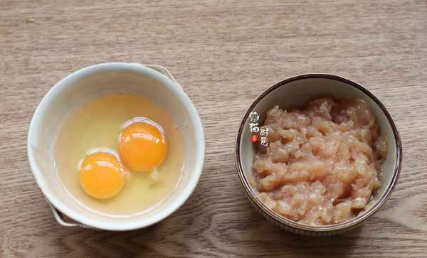 另外准备一些菜,我准备的两个鸡蛋和鸡胸肉,鸡胸肉剁碎,拌入淀粉和适量油、盐拌匀腌制入味。