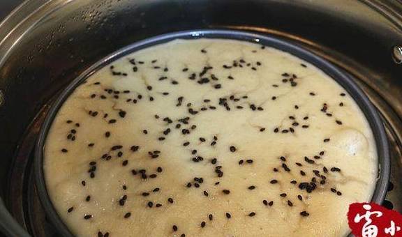 3、室温发酵至1.5倍大,再撒入一点黑芝麻,冷水上锅蒸25分钟,关火后再焖3分钟开锅,放凉后脱模切块。