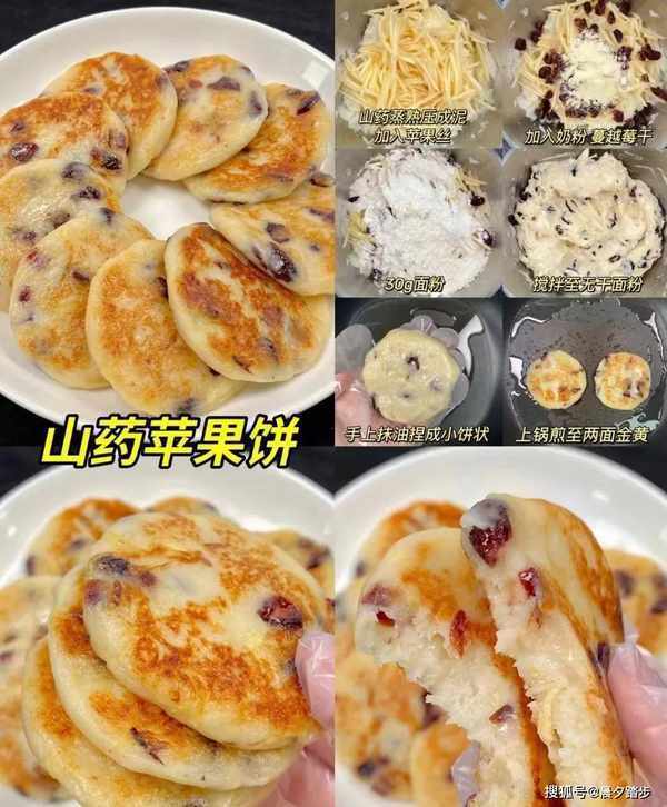 做法:山药蒸熟挤成泥,加入苹果碎、奶粉、蔓越莓干、面粉30克,搅拌至无干粉,双手抹油,取一块面团揉至小蛋糕,放入锅中煎至两面金黄