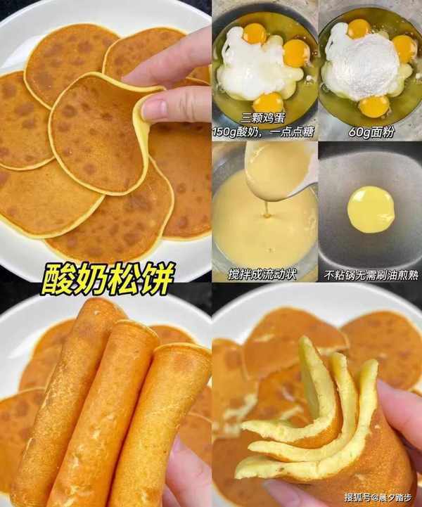 做法:鸡蛋三个,酸奶150克,白糖少许(可有可无),面粉60克,搅拌成液态,不用勺子刷油,用勺子舀出少许粘稠的糊状物,倒入锅中炒熟在两侧。