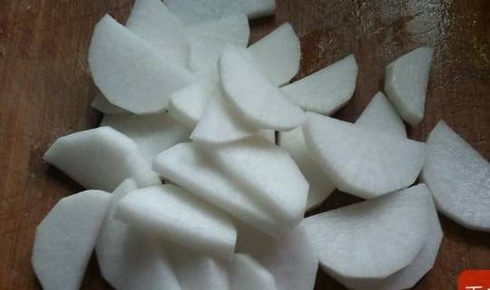 7.萝卜削皮对半切开,切成片,
