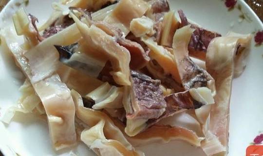 3.把墨鱼干剪成一厘米宽的长丝,洗净备用