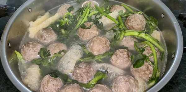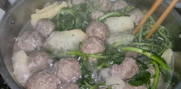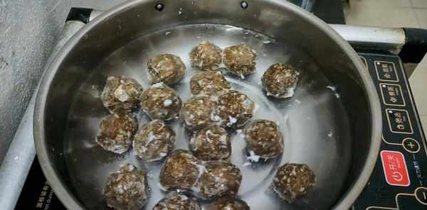锅中烧开水,从冰箱中取出手工牛肉丸,提前放入锅中,大火烧开,转小火煮5分钟,至丸子熟透。