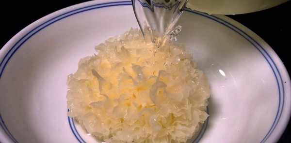 取一只白蘑菇放入大碗中,加水,放入白蘑菇浸泡10分钟。