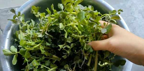 烧开后调味加一勺盐,一勺味精,搅拌均匀,炒至香料融化,水烧开用大火煮五分钟左右,时间到了,加入洗净的西洋菜,时间不宜过长,一分钟煮左右就好。