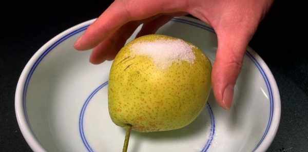 将雪梨洗净,用削皮刀剥去外皮,对半切开,去掉梨核,然后切成小块,放入碗中待用。