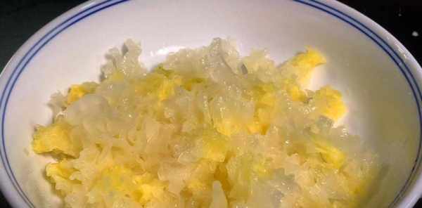 十分钟后,打开盖子,搅拌至银耳出胶,莲子体积膨胀不少。加入切碎的梨和红枣,小火煮30分钟。