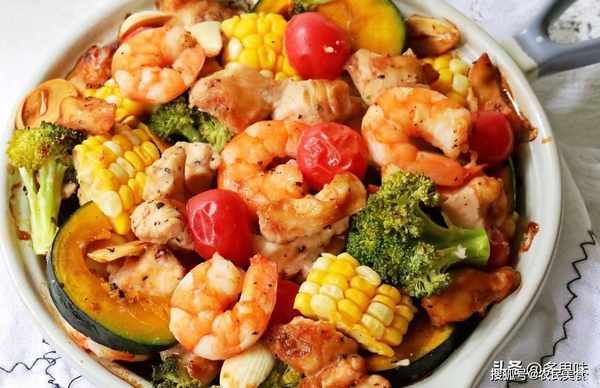 食材:鸡胸肉,虾,玉米,南瓜,小番茄,西兰花,蒜,料酒,生抽,盐适量,黑胡椒碎适量,橄榄油