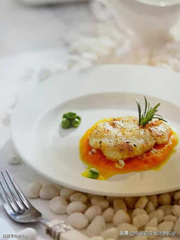 5.南瓜泥和薏米混合铺底,将煎好的鳕鱼放在上面,点缀迷迭香即可。
