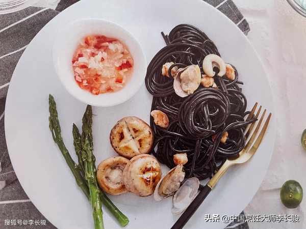墨鱼汁海鲜意面配时蔬