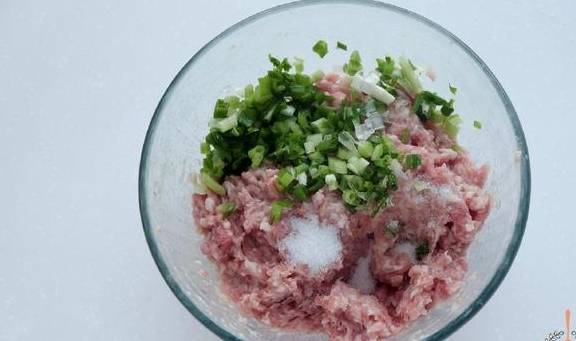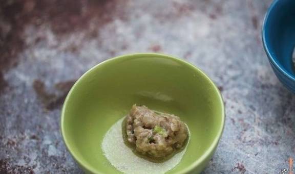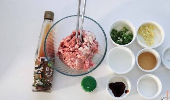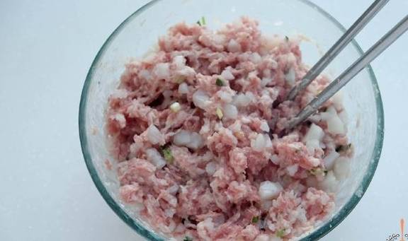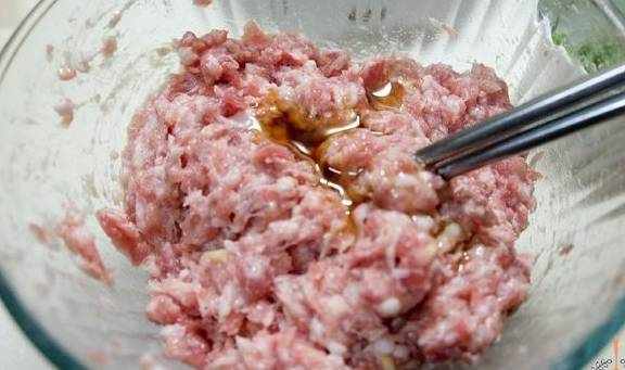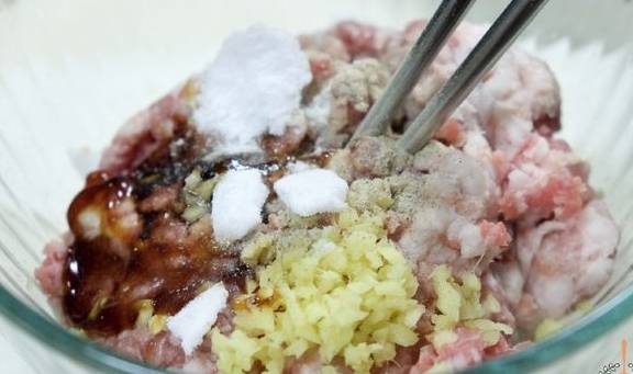 1.500克猪肉馅中,加15毫升料酒、8克盐、10克蚝油、适量白胡椒粉、姜末,用筷子往同一方向搅拌,这样肉馅才会上劲。