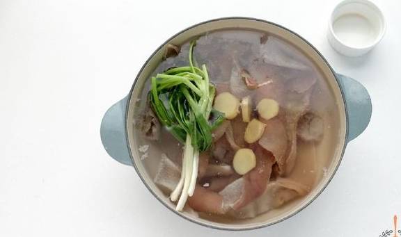 3.将猪皮和冷水以1:4的比例入锅,加葱结,姜片和料酒煮开,转小火煮两小时,等汤汁变白,就可以关火,取出肉皮,