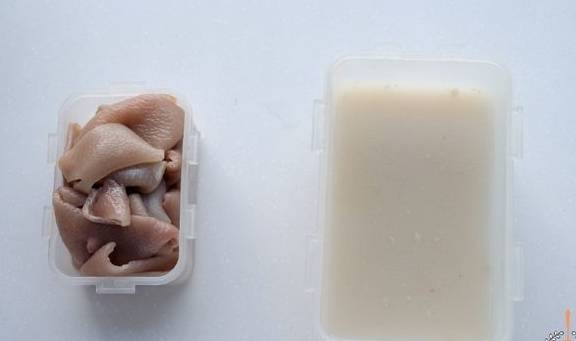 4.等汤汁放凉后倒入容器中,放入冰箱冷藏成肉皮冻;